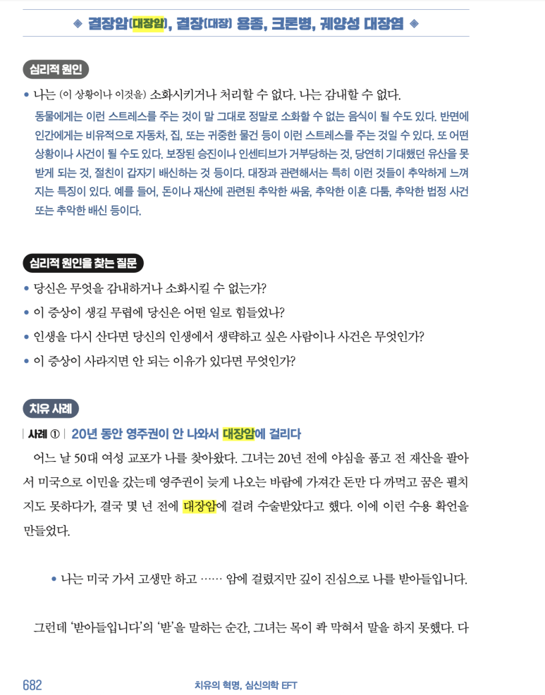 먼저 <치유의 혁명 심신의학 EFT>에 나오는 대장암의 원인을 한 번 보자.