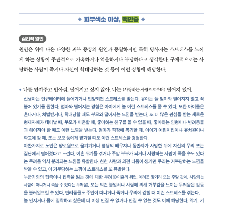 그럼 백반증은 왜 생기는 것인지 <치유의 혁명, 심신의학 EFT> 341쪽을 한 번 살펴보자.