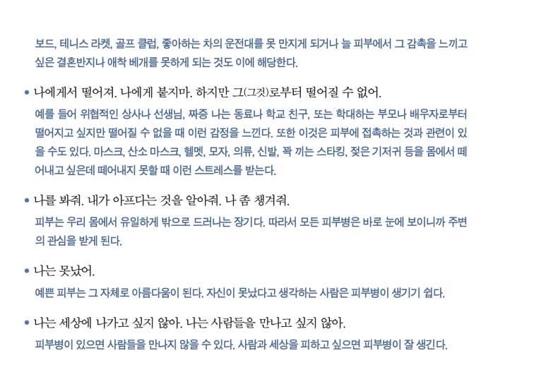 피부는 우리 몸에서 유일하게 밖으로 드러나는 장기다. 따라서 모든 피부병은 바로 눈에 보이니까 주변의 관심을 받게 된다.