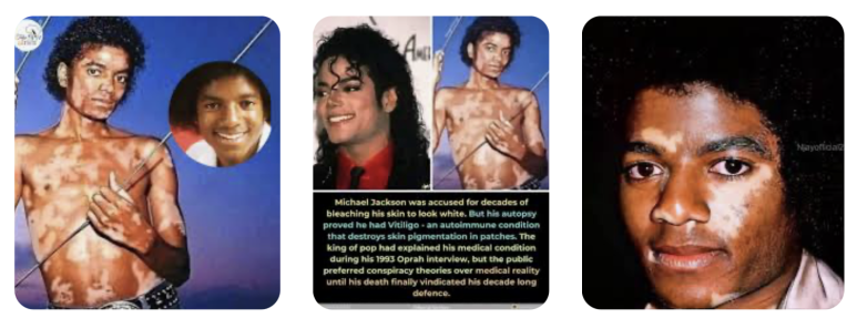 한때 팝의 전설이었고 팝의 황제로 불린 마이클 잭슨! 마이클 잭슨(1958-2009)은 색소가 손실되어 피부에 흰 반점이 생기는 피부 질환인 백반증을 심하게 앓았고 1980년대에 진단을 받았다. 이 백반증은 그가 고의적으로 자신의 피부를 탈색해서 백인이 되고 싶어한다는 대중의 의혹을 불러일으키기도 했고, 잭슨은 이것때문에 또 더욱 더 상처받았다.