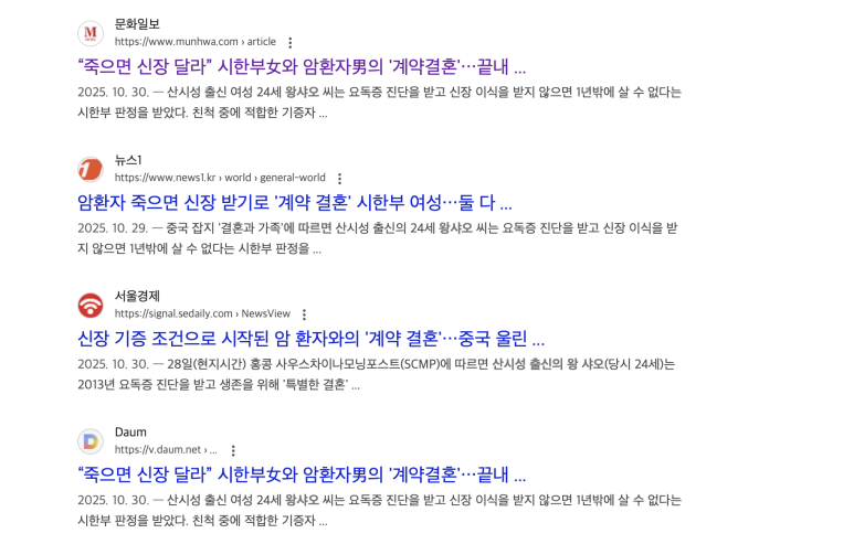 산시성 출신 여성 24세 왕샤오 씨는 요독증 진단을 받고 신장 이식을 받지 않으면 1년밖에 살 수 없다는 시한부 판정을 받았다. 친척 중에 적합한 기증자가 없자 절박해진 왕 씨는 파격적인 선택을 했다. 동료 환자의 제안에 따라 암 지원 단체에 결혼 광고를 올린 것. 그녀는 남편이 세상을 떠난 후 신장을 기증받을 수 있도록 자신과 결혼해 줄 말기 환자 남성을 찾았다. 왕 씨는 광고에 “결혼 후에도 최선을 다해 당신을 돌보겠습니다. 용서해 주세요. 저는 그저 살고 싶을 뿐입니다”라고 적었다.
